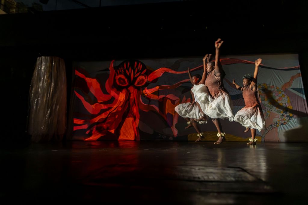 A performance centrava-se em quatro mulheres, sendo uma delas a que levantava a voz. À margem, estavam outras cinco mulheres vestidas de capulanas de cores vermelhas, o m’siro no rosto e o sentar de quem sabe que já nada se pode fazer. As cinco mulheres integrantes do grupo Tufo da Mafalala, faziam o coro do choro, e assistiam, sem que nada pudessem fazer, os corpos de outras quatro mulheres, em transe, a renascerem, a saírem do fundo do mar para estenderem-se ao sol dos vivos e às areias quentes de África, junto dos seus filhos, que ficaram para trás apenas por serem matéria sem utilidade nos campos de plantação da cana-de-açúcar e do algodão; filhos que viram partir as mães em troca do choro, do abandono despreparado e dos tormentos aos ventos noturnos, que escancaram os barulhos da ausência do côlo materno: