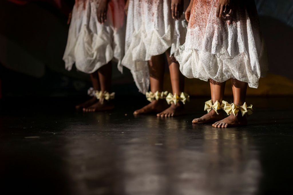 O jogo entre palavras, a música que vinha de toda a parte, da voz das mulheres de m’siro no rosto e campulanas vermelhas, dos chocalhos amarrados aos pés das bailarinas e do próprio pé descalço a bater no cimento queimado, conferiram mistério necessário para que se entrasse no coração da aflição. Elas queriam regressar à sua terra, antes que fosse tarde, antes que a terra não as conhecesse mais.